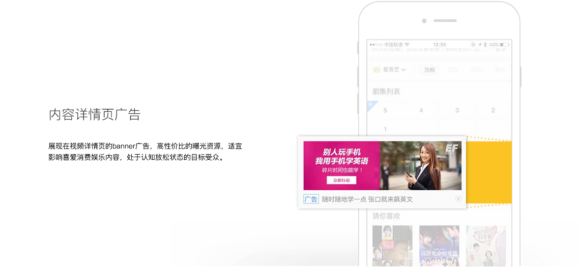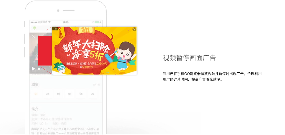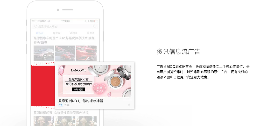 手机QQ浏览器依托腾讯社交大数据,结合深度分析的用户浏览兴趣偏好,再一次将沉浸式的原生广告体验呈现在用户面前。 您的广告将主要出现在资讯信息流、内容详情页、视频暂停画面中。