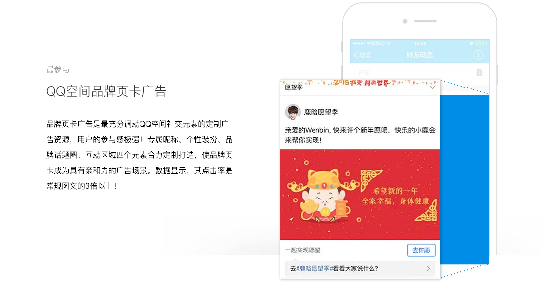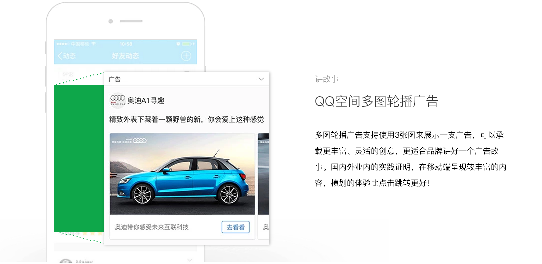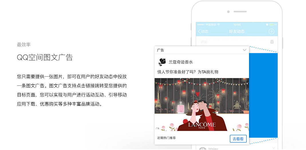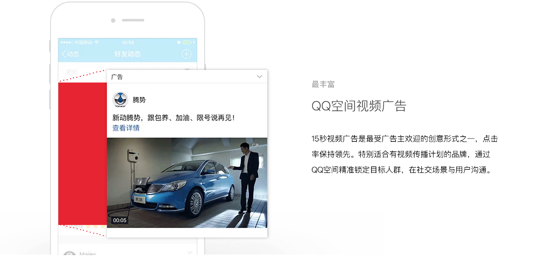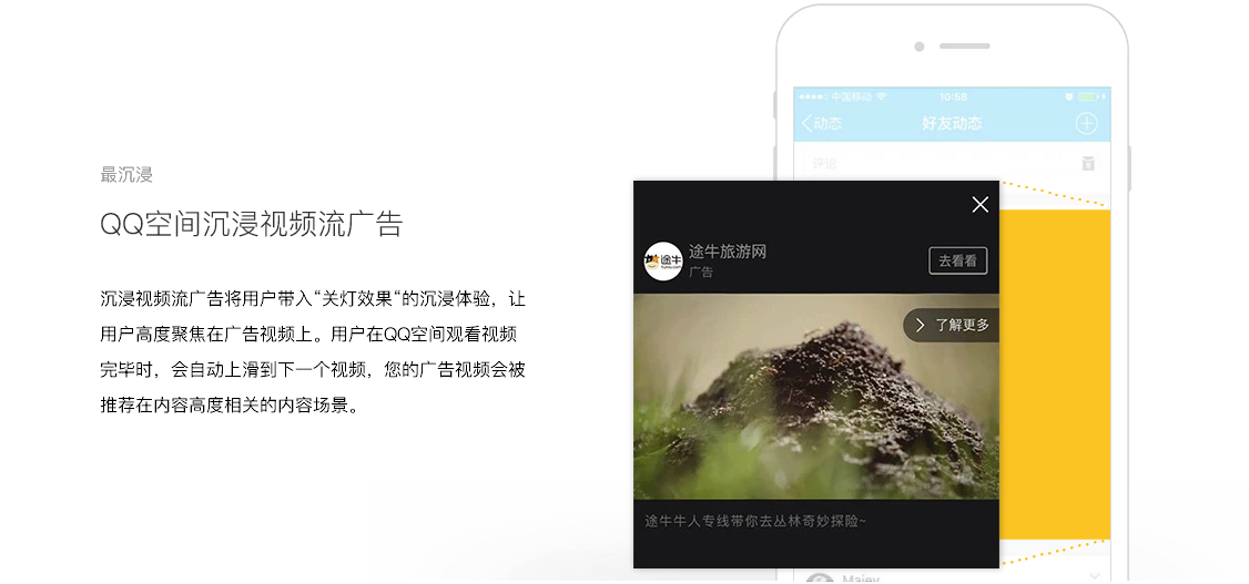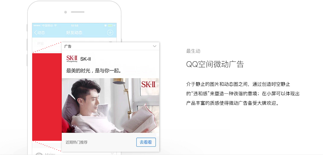 QQ空间拥有活跃账户6.4亿,6成以上的用户为90后年轻用户。QQ空间信息流广告出现在用户的好友动态中,是一种融入在用户UGC中的原生社交广告,拥有用户天然、无违和感的关注,非常适合品牌在社交场景与年轻人沟通。
